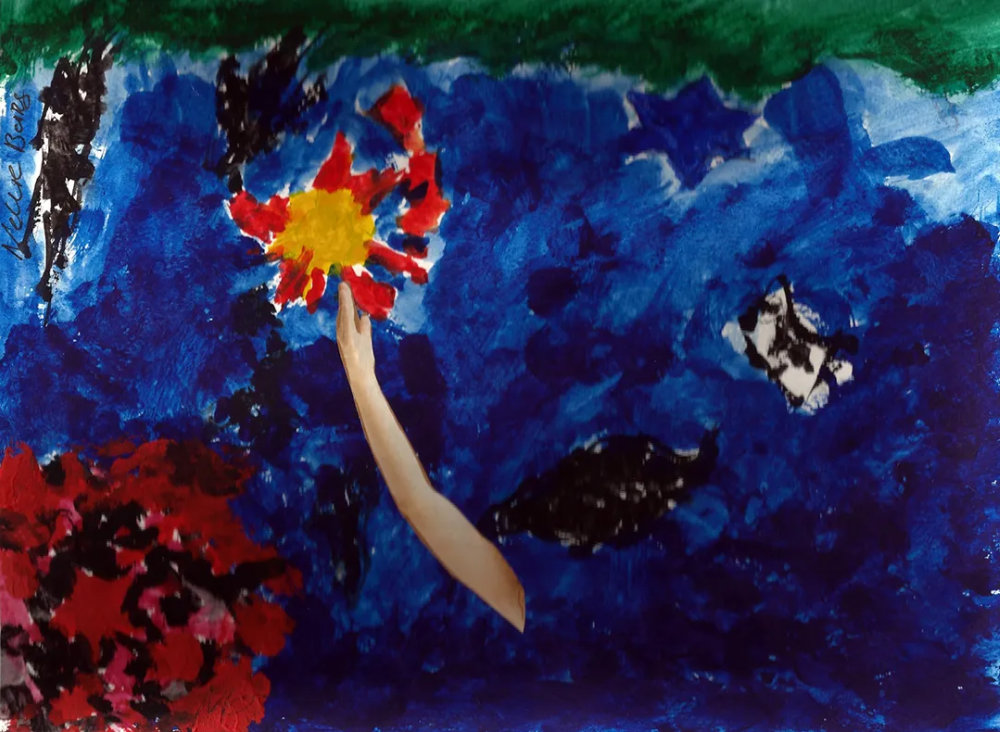 I painted the ocean in dark blue colors. There are some spots of lighter blue amidst the darkness. Perhaps islands where I lived before or dolphins trying to rescue me. In the middle of the ocean, my arm is reaching for the sun, which looks more like a yellow and red exotic flower. Land, a few bright green lines at the top of the canvas, is still far away.